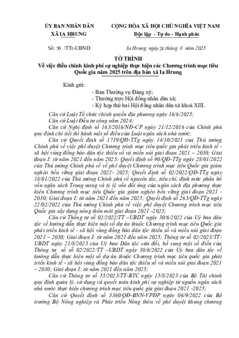 | Tiêu đề văn bản | 50_TTr về điều chỉnh kinh phí sự nghiệp thực hiện các Chương trình mục tiêu Quốc gia năm 2025 trên địa bàn xã Ia Hrung | ||