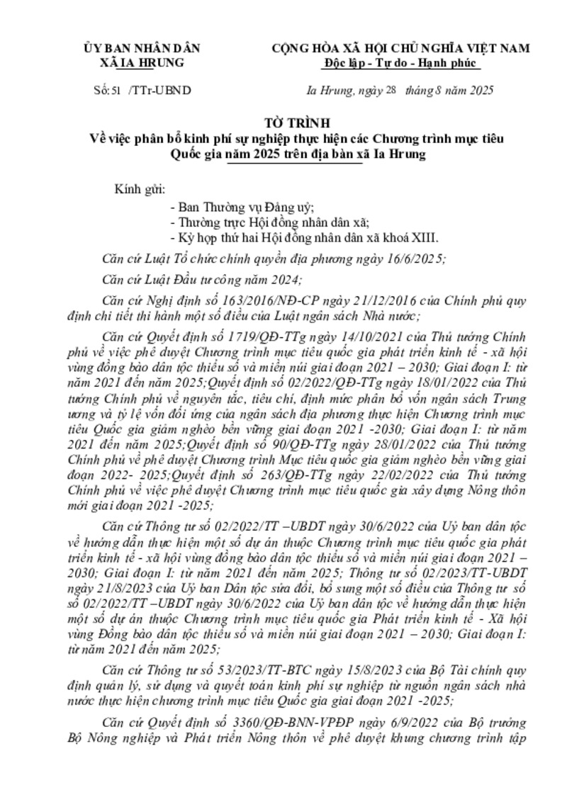 Tiêu đề văn bản | 51_TTr về phân bổ kinh phí sự nghiệp thực hiện các Chương trình mục tiêu Quốc gia năm 2025 trên địa bàn xã Ia Hrung | ||