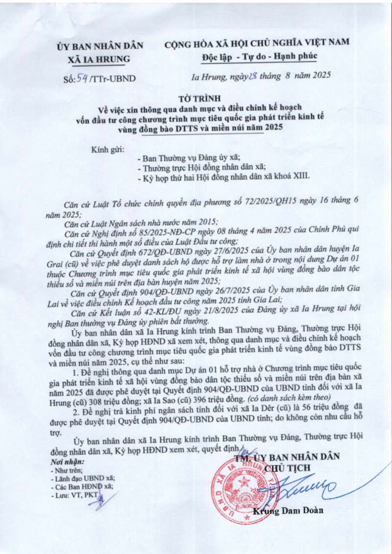 Tiêu đề văn bản | 54_TTr về xin thông qua danh mục và điều chỉnh kế hoạch vốn đầu tư công chương trình MTQG phát triển kinh tế vùng đồng bào DTTS và miền núi năm 2025 | ||