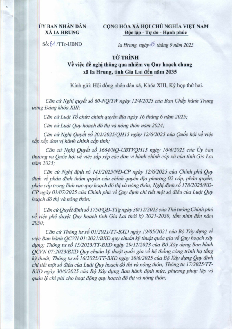 Tiêu đề văn bản | 61_TTr về đề nghị thông qua nhiệm vụ Quy hoạch chung xã Ia Hrung tỉnh Gia Lai đến năm2 025 | ||