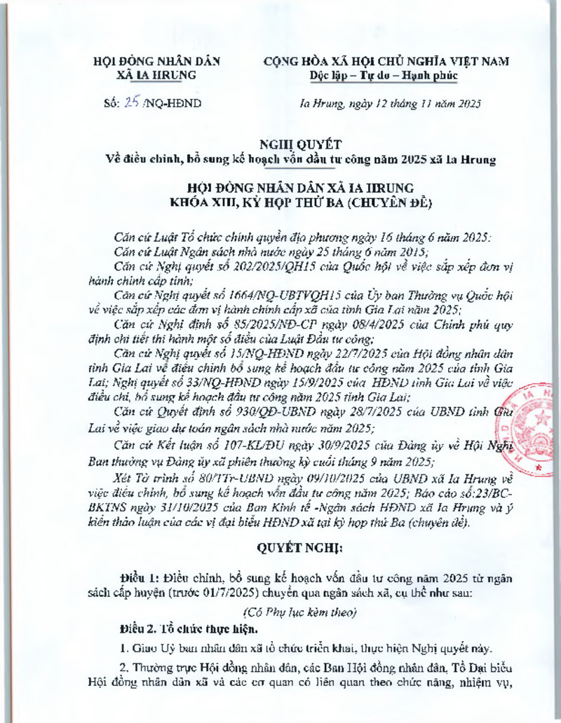 | Tiêu đề văn bản | Về điều chỉnh, bổ sung kế hoạch vốn đầu tư công năm 2025 xã Ia Hrung | ||