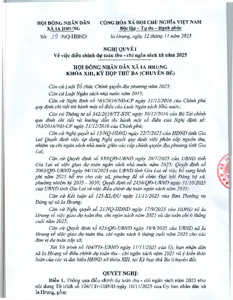 | Số hiệu | 29/NQ-HĐND | Cơ quan ban hành | HĐND xã Ia Hrung |