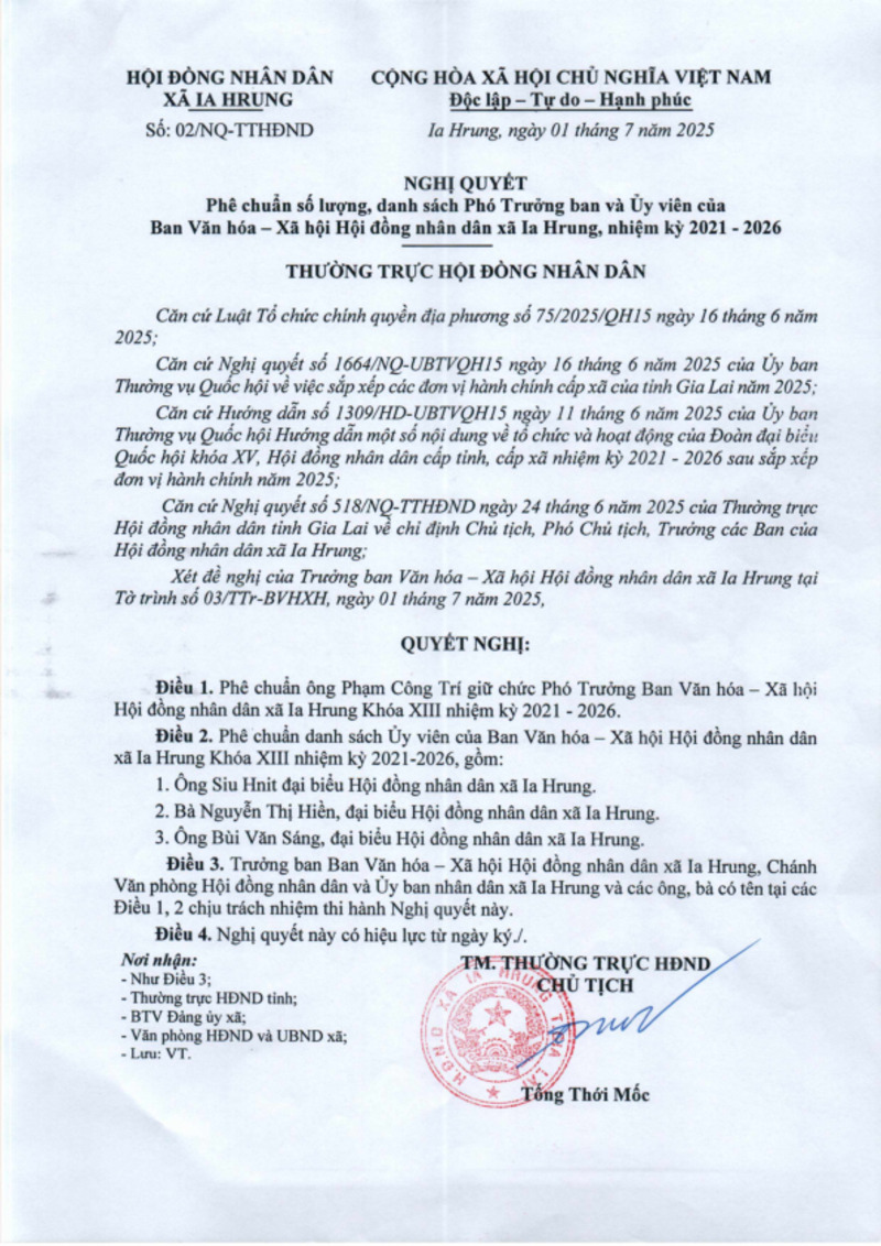 | Tiêu đề văn bản | Phê chuẩn số lượng, danh sách Phó Trưởng ban và Ủy viên của Ban Văn hóa – Xã hội Hội đồng nhân dân xã Ia Hrung, nhiệm kỳ 2021 - 2026 | ||