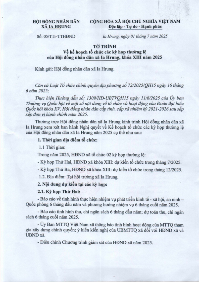 | Tiêu đề văn bản | TỜ TRÌNH Về kế hoạch tổ chức các kỳ họp thường lệ của Hội đồng nhân dân xã Ia Hrung, khóa XIII năm 2025 | ||