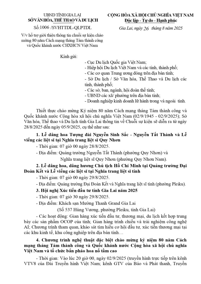 Thứ sáu, 29/08/2025 | 08:35 A- A A+ | Giới thiệu thông tin chuỗi sự kiện chào mừng 80 năm Cách mạng tháng Tám thành công và Quốc khánh nước CHXHCN Việt Nam Chia sẻ Đọc bài Lưu Nguồn:Sở Văn hóa, Thể thao và Du lịch Sao chép liên kết
