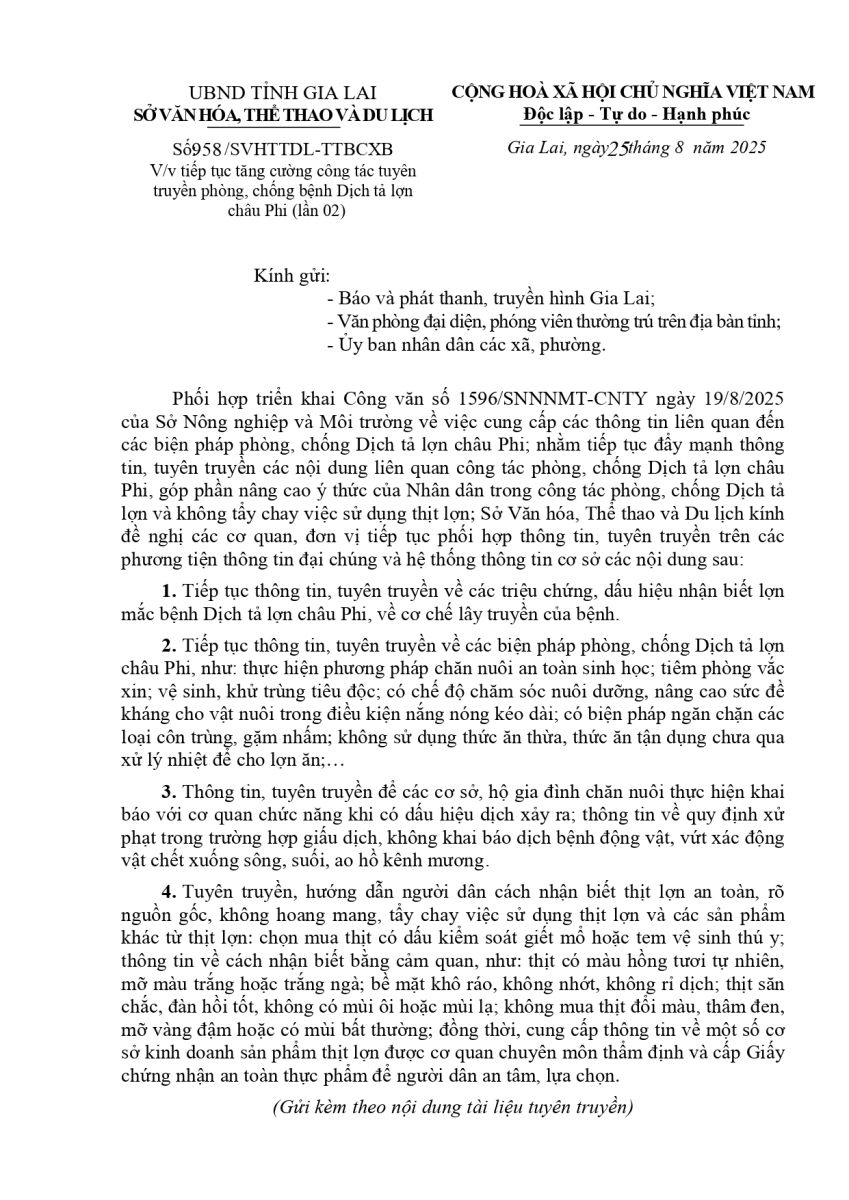 Thứ sáu, 29/08/2025 | 08:23 A- A A+ | Tăng cường công tác tuyên truyền phòng, chống bệnh Dịch tả lợn châu Phi Chia sẻ Đọc bài Lưu Nguồn:Sở Văn hóa, Thể thao và Du lịch Sao chép liên kết