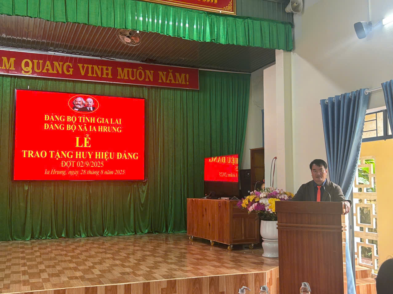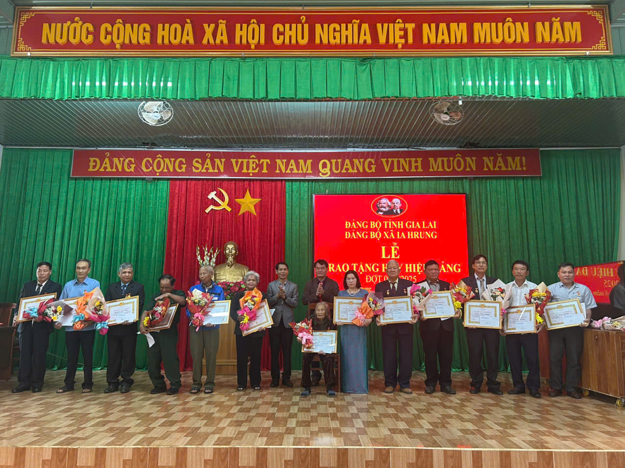 Sáng ngày 28/8/2025, Đảng bộ xã Ia Hrung đã long trọng tổ chức lễ trao tặng huy hiệu Đảng cho 13 đảng viên lão thành. Trong không khí trang nghiêm và đầy tự hào của cả dân tộc chào mừng 80 năm Cách mạng tháng Tám và Quốc khánh 2/9. Trong đợt này, các đồng chí được trao tặng huy hiệu Đảng ở các mốc 30, 40, 45, 50, và 60 năm tuổi Đảng. Đây không chỉ là niềm vinh dự của cá nhân mà còn là niềm tự hào của toàn Đảng bộ xã Ia