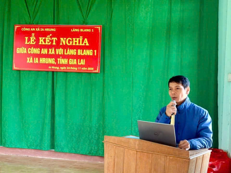 Thực hiện Chủ trương của Ban Thường vụ Tỉnh ủy và Đảng ủy xã Ia Hrung, đồng thời, tăng cường hơn nửa mối quan hệ gắn bó mật thiết giữa cấp ủy, chính quyền, lực lượng Công an xã với nhân dân và các thông làng đồng bào DTTS trong phát triển kinh tế - xã hội, xây dựng hệ thống chính trị, đảm bảo an ninh, trật tự. Sáng ngày 26/11/2025 tại Hội trường làng Blang 1, Công an xã Ia Hrung phối hợp với làng Blang 1 long trọng tổ chức Lễ Kết nghĩa. Đến tham dự buổi Lễ, có đồng chí Krung Dam Đoàn – Phó Bí thư Đảng ủy, Chủ tịch UBND Xã; đồng chí Thượng tá, xã Ê Ban Chí - Ủy viên Ban Thường vụ Đảng ủy xã, Bí thư Đảng ủy, Trưởng Công an xã; đồng chí Puih Rên – Bí thư Chi bộ, kiêm Thôn trưởng làng Blang 1, cùng đại diện lãnh đạo các ban ngành, đoàn thể xã; toàn thể Chỉ huy, cán bộ, chiến sĩ Công an xã và nhân dân các dân tộc tại làng Blang 1